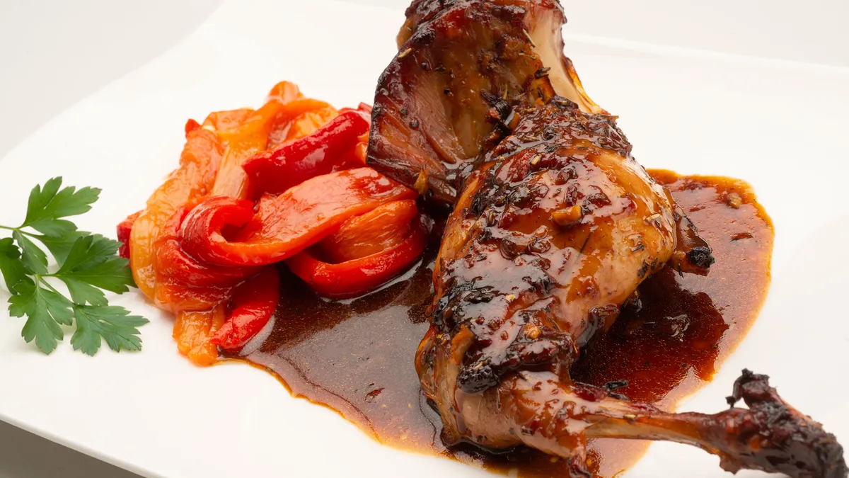 Conejo al horno con majado de ajo y jengibre y pimientos morrones