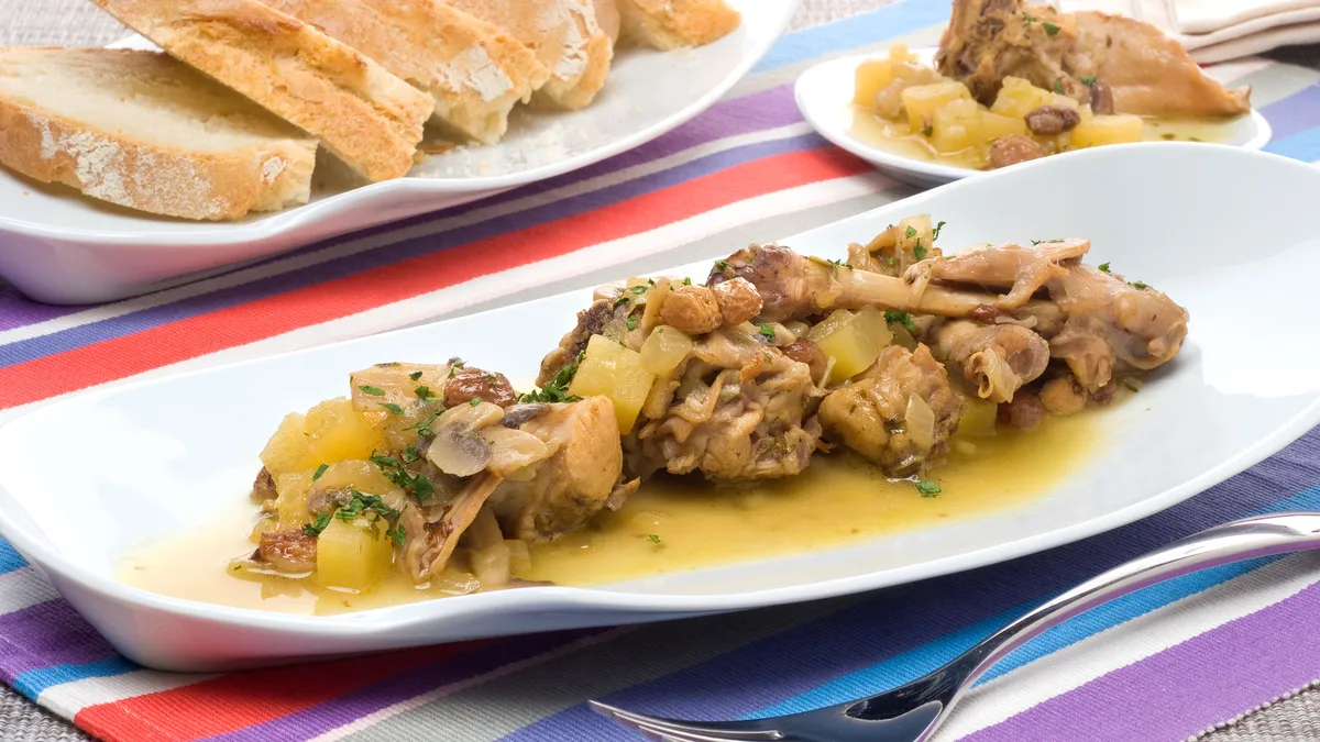 Receta de conejo guisado con champiñones, un plato delicioso con patatas, champiñones y pasas en vino blanco, cocinado con conejo.