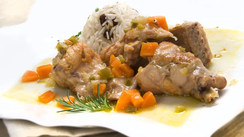 Receta para aprender a preparar un guiso de conejo a la sidra con verduras y arroz basmati para acompañar.