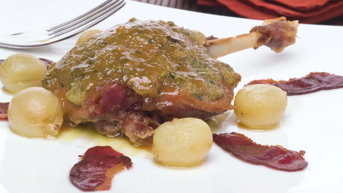 Receta de confit de pato al horno con uvas, un plato rico con crujiente de jamón de pato, confit de pato al horno, salsa de uva y majado provenzal, de Eva Arguiñano.