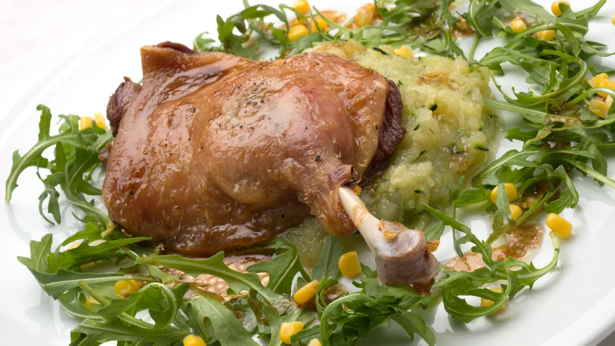 Receta de Karlos Arguiñano de confit de pato asado en el horno con puré de manzana y calabacín y ensalada de rúcula.