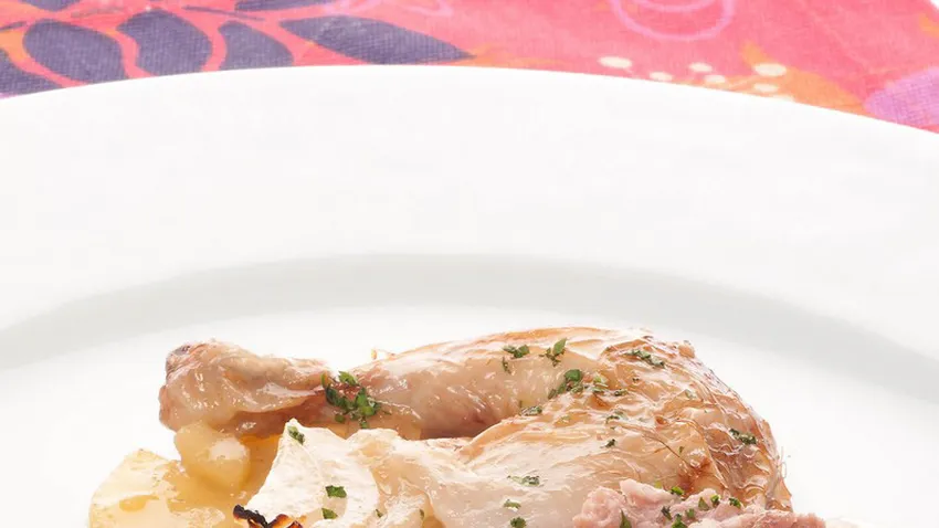 Retira la lid y trincha los coquelet. Sirve una porción en cada plato y acompaña con la guarnición.