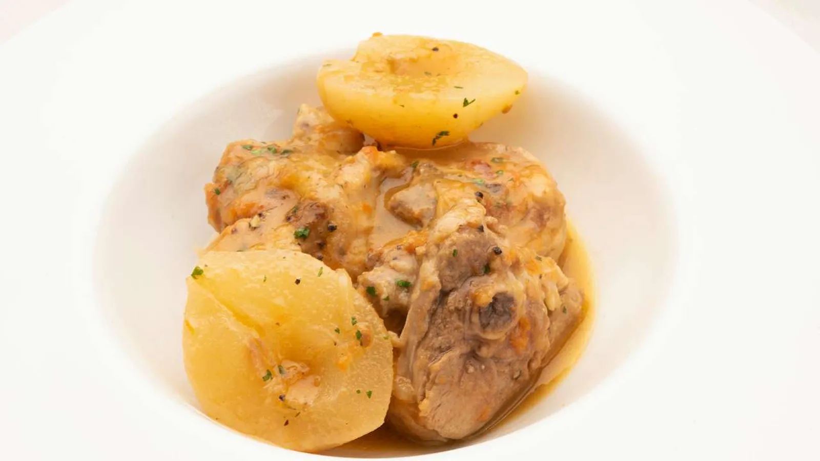 Corta las peras por la mitad, retírales el corazón y pélalas. Incorpóralas a la cazuela y cocina todo conjuntamente durante 20 minutos más. Salpimienta y espolvorea con un poco de perejil picado.