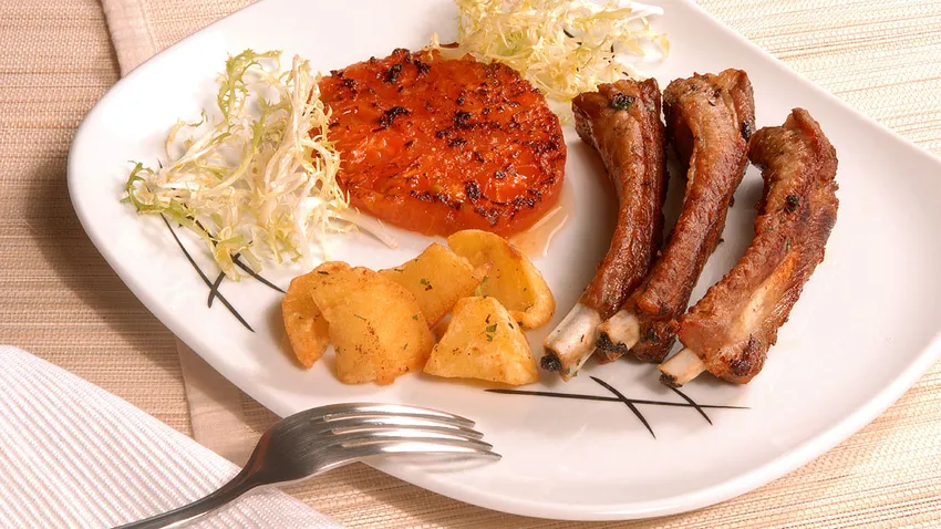 Receta de costilla de cerdo con patatas salvajes, un plato sencillo con cerdo asado, tomates y patatas fritas, acompañado de escarola. Receta de Karlos Arguiñano.