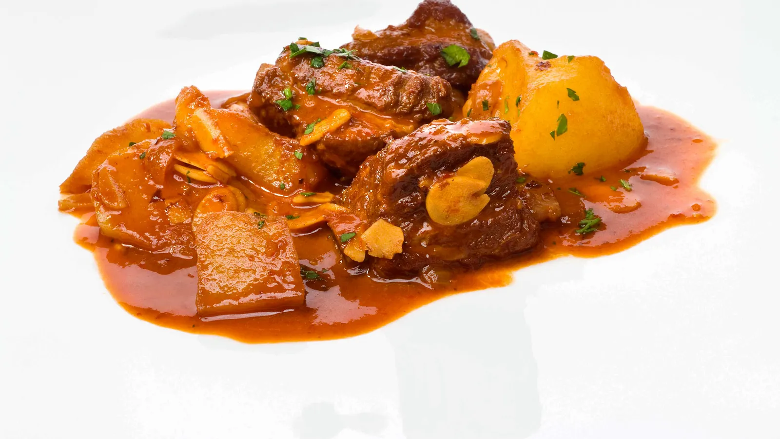 Receta de costilla guisada con choriceros y zumo de naranja, un cocido de ternera con almendras, ajo, cebolla, pimientos y naranja servido con patatas fritas, de Bruno Oteiza.