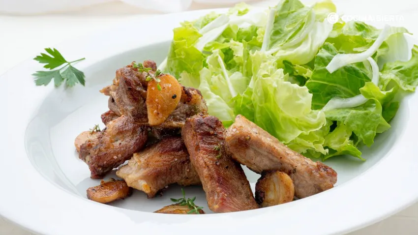No sé si hay alguien a quien no le gusten las costillas de cerdo. La verdad es que se pueden preparar de mil maneras. Pueden servirse solas o acompañadas de diferentes guarniciones como patatas y ensalada. O como estas costillas de cerdo al ajillo que nos propone Karlos Arguiñano, acompañadas de una clásica ensalada de lechuga y cebolleta. Es una receta de costilla de cerdo fácil, sencilla y deliciosa, ¡puedes comerlas a mano y relamer cada huesito!