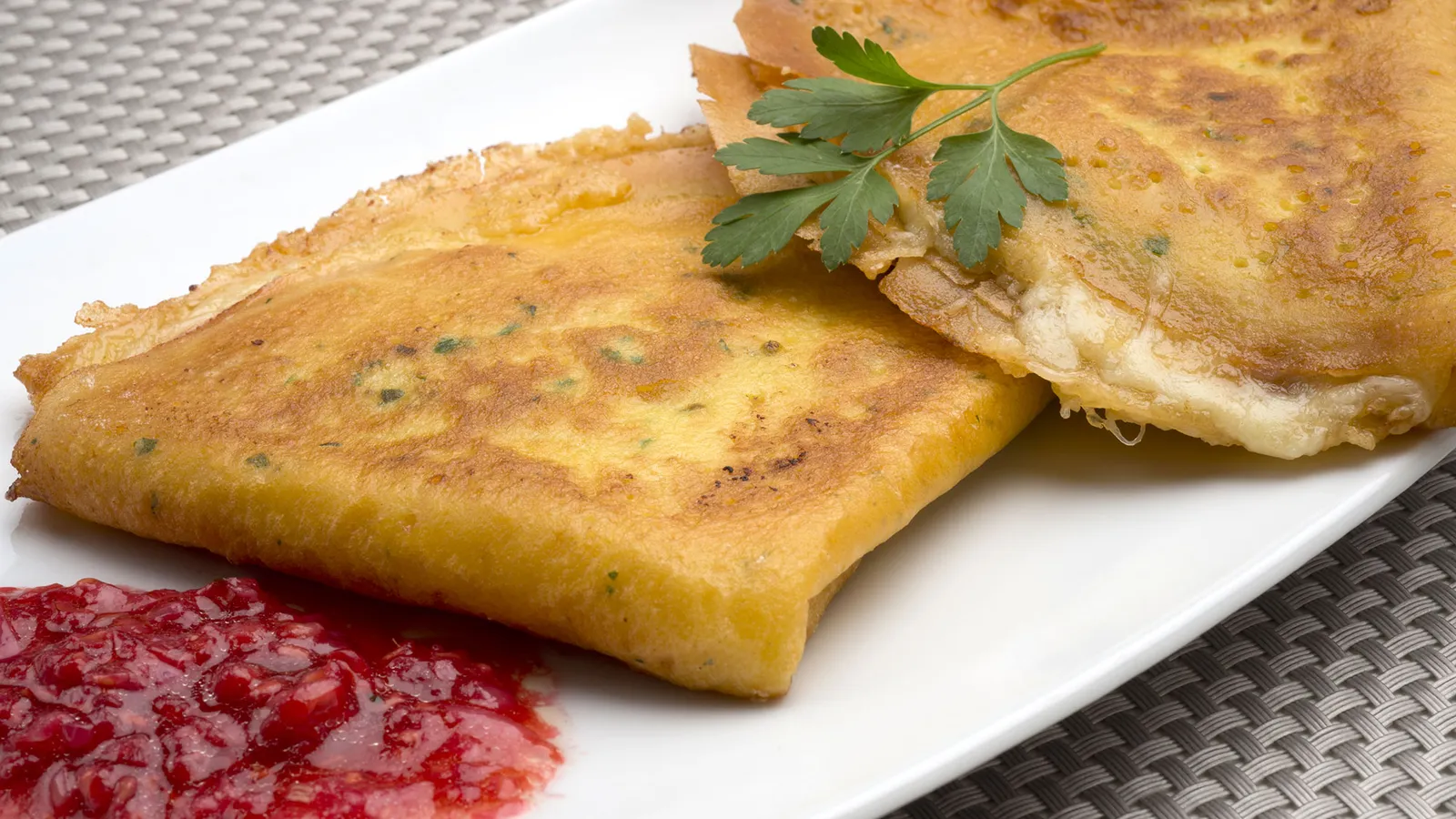 Crepes de jamón y queso con salsa de frambuesas