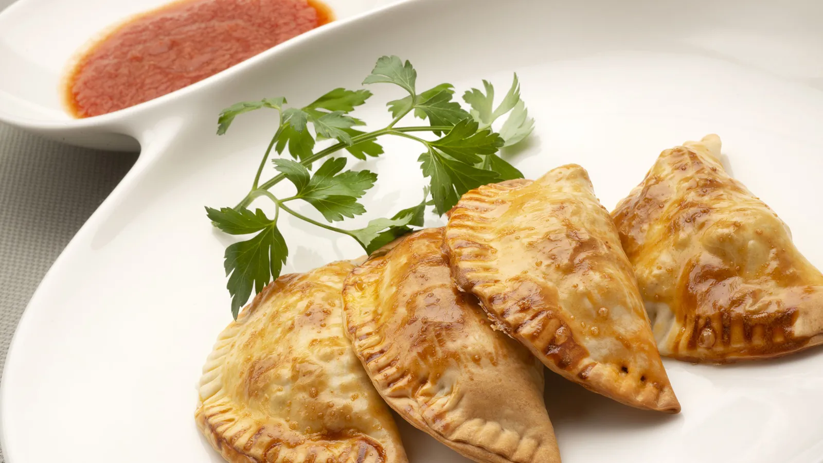 Sirve las empanadillas y acompáñalas con la salsa de tomate. Decora con una hoja de perejil.