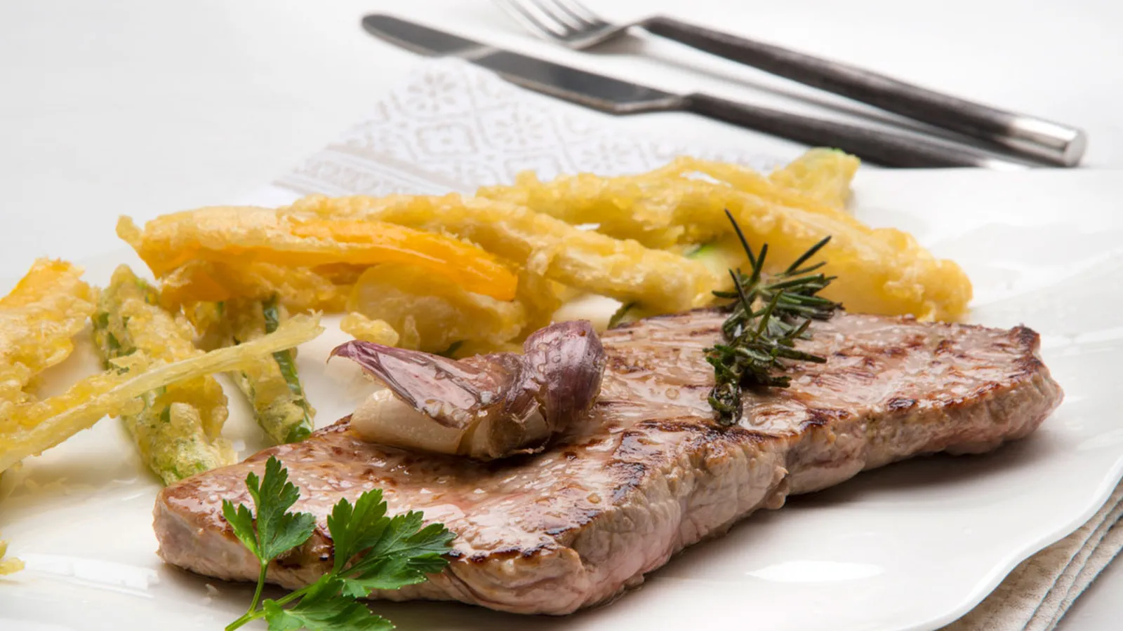 Receta de Karlos Arguiñano de entrecot de ternera cocinado a la plancha acompañado de verduras en tempura.