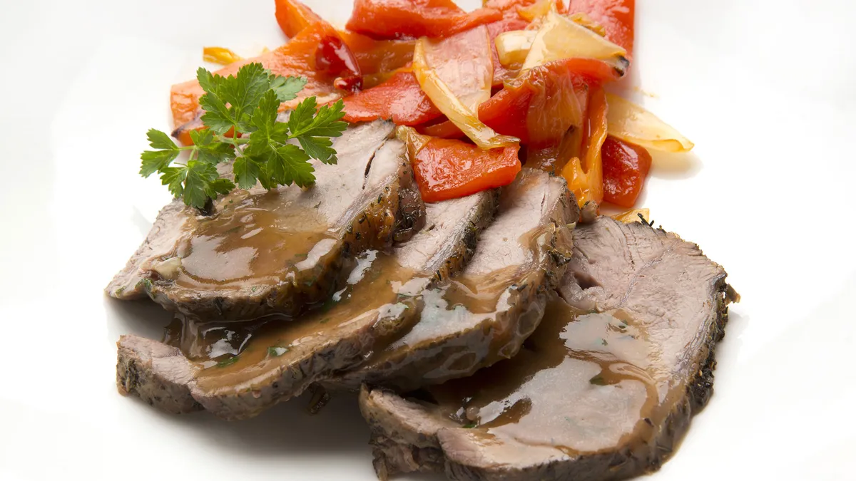 Sirve la carne (sin la cuerda), salsea y acompáñala con los pimientos y la cebolleta. Adorna con unas hojas de perejil.
