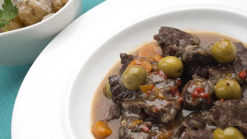 Pela y pica las cebollas y ponlas a rehogar en una tartera con un poco de aceite. Pela los ajos y añádelos en entero. Sazona. Pela el pimiento, pícalo en dados y agrégalo. Sazona la carne de cabra y añádela. Pela las zanahorias, córtalas en lonchas e introduce. Vierte el vino y dale un hervor. Cubre con agua y agrega el comino, el tomillo, el pimentón, la hoja de laurel y la guindilla en entero. Pon a punto de sal, coloca la tapa y cocina todo durante 2 horas y 15 minutos a fuego suave. Añade las aceitunas y cocina 15 minutos más.