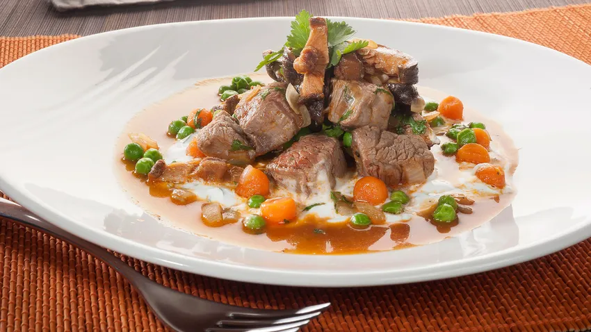 Coloca una base de salsa de yogur en el plato. Pon encima el estofado de carne. Sirve.