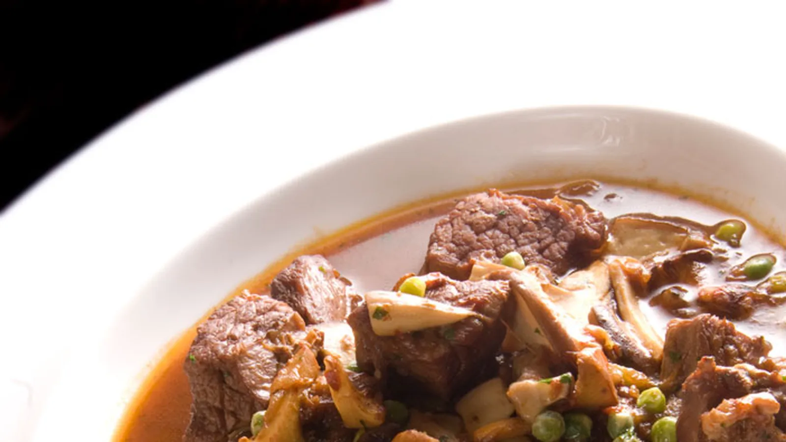 Receta de falda de ternera guisada con setas, guisantes y una salsa de vino tinto y pimientos choriceros.