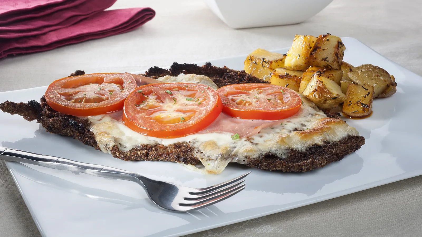 Presenta los filetes empanados con jamón y queso acompañados de las patatas. Espolvorea con perejil picado. Sirve.