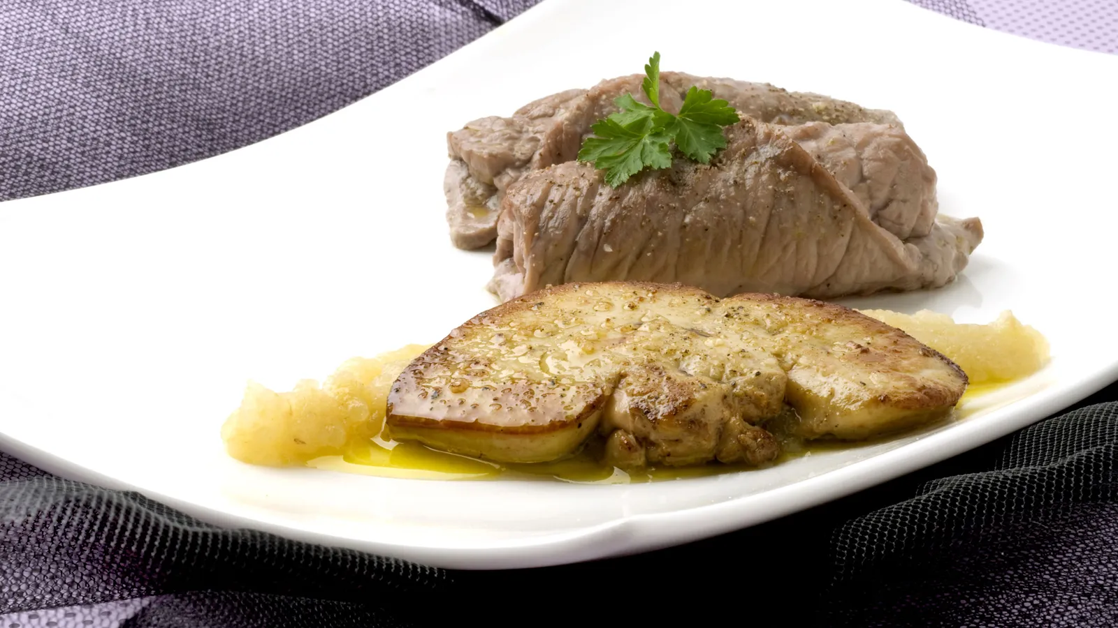Corta los filetes de ternera por la mitad y sazónalos. Corta unas lonchas finas de foie (reserva el resto) y coloca sobre la carne. Enrolla los filetes y pincha con un palillo. Coloca los rollitos en una bandeja untada con aceite, espolvorea con pimienta molida y hornea a 200º C., durante 6-8 minutos.
