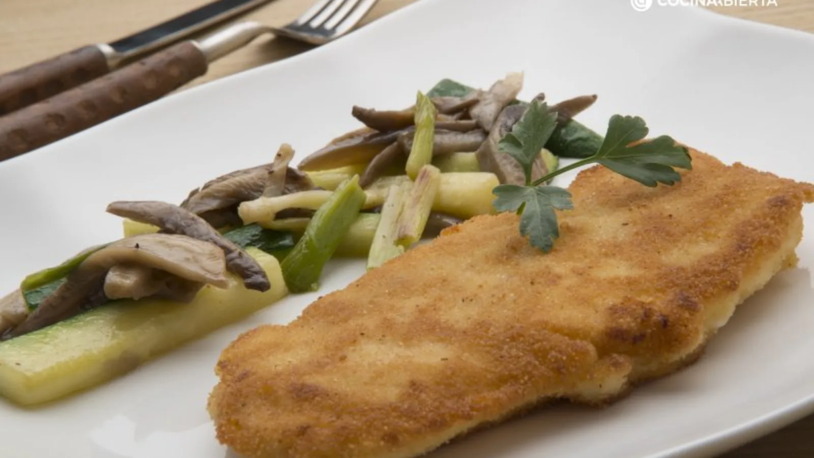 Receta de Karlos Arguiñano de filetes de pollo con bechamel empanados y rellenos de jamón y queso, un plato similar a un San Jacobo. Como guarnición, setas, ajos frescos y calabacín salteados.