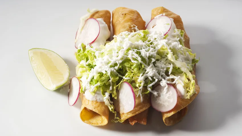 Receta de flautas de pollo fritas con crema fresca y salsa verde, un plato típico de la cocina mexicana que nos propone el cocinero Enrique Fleischmann.