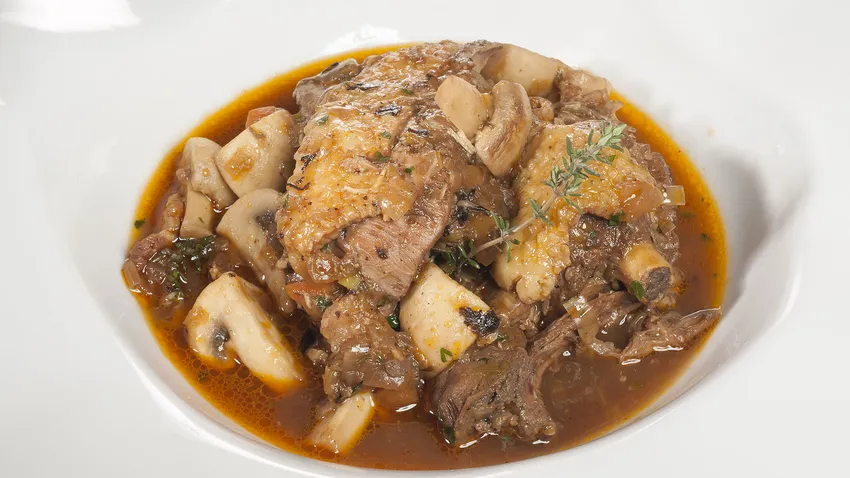 Bruno Oteiza prepara gallo al vino o coq au vin, un plato tradicional de la cocina occitana (Francia) que consiste en un guiso de gallo en vino con verduras y setas.