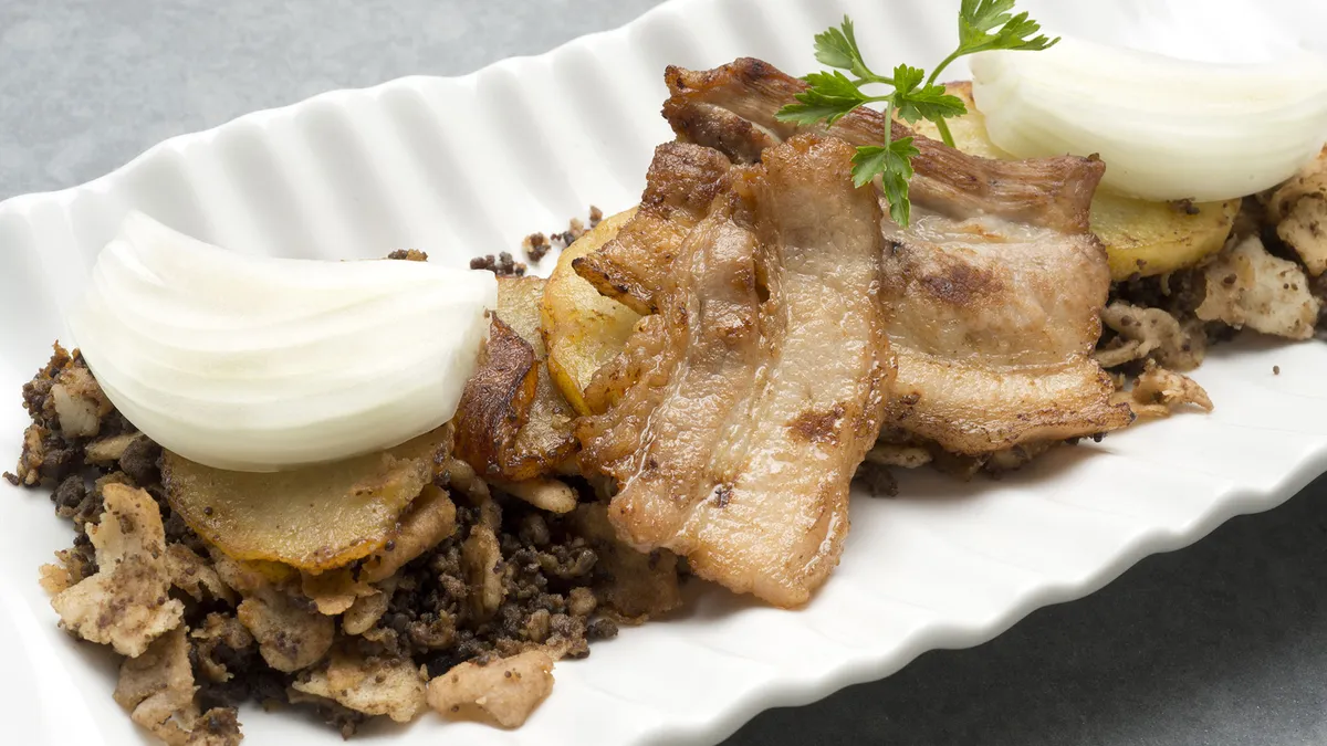 Añade el hígado de cerdo triturado y las sollapas (remojadas y escurridas) a la tartera. Sofríe todo junto durante unos 40 minutos sin dejar de remover, hasta que quede un gazpacho homogéneo y consistente que pueda removerse y voltearse sin quedar adherido a la sartén (esto se llama tostar los gazpachos). Añade las patatas y sazónalas. Incorpora la panceta y unos gajos de cebolla cruda. Adorna con unas hojas de perejil.