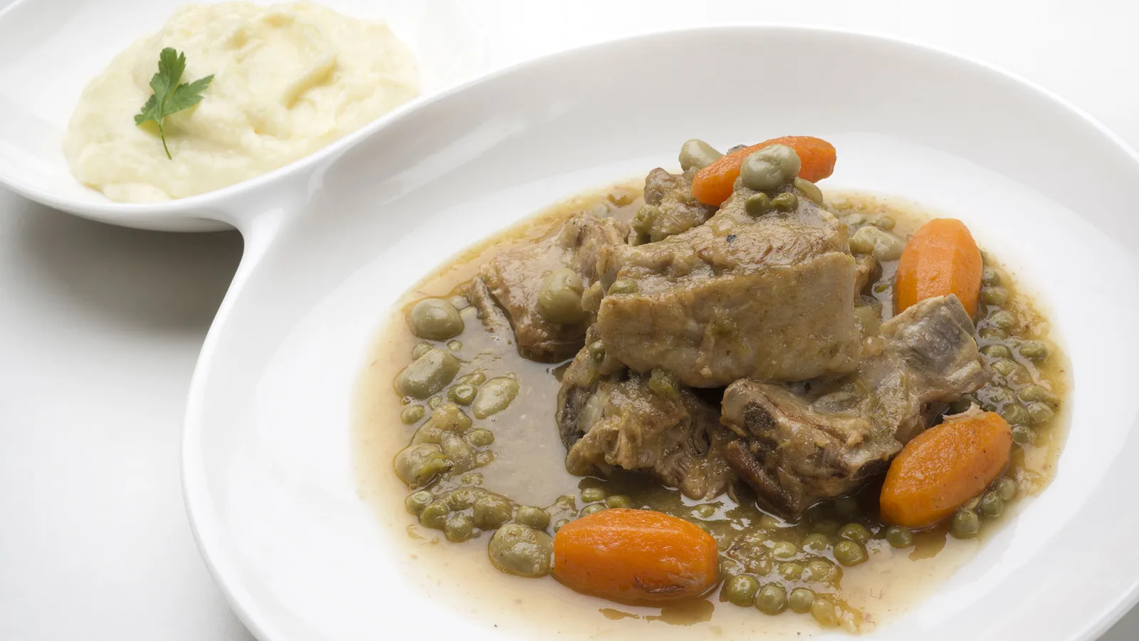 Sirve el guiso de cordero y acompáñalo con el puré de patatas. Decora con una hojita de perejil.