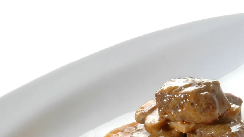 Rehoga bien y vierte el brandy. Cocina a fuego suave. Incorpora los champiñones a la carne y agrega el caldo. Pon la tapa a la olla y cocinan el guiso durante 15 minutos. Rehoga la harina en una sartén con un poco de aceite. Remueve bien, agrega el pimentón y la nata, sin dejar de remover. Cuece durante 2 minutos y vierte a la carne. Pon a punto de sal.