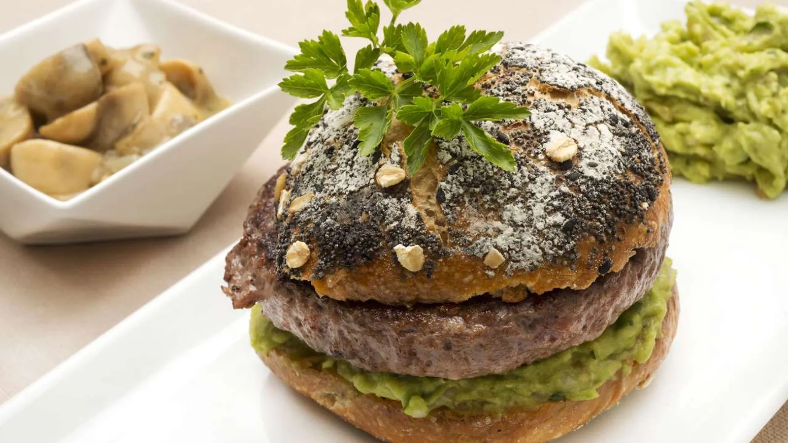 Cocina las hamburguesas a la plancha. Unta los bollos de pan con el guacamole y rellénalos con las hamburguesas. Sirve las hamburguesas con los champiñones. Decora con una ramita de perejil.
