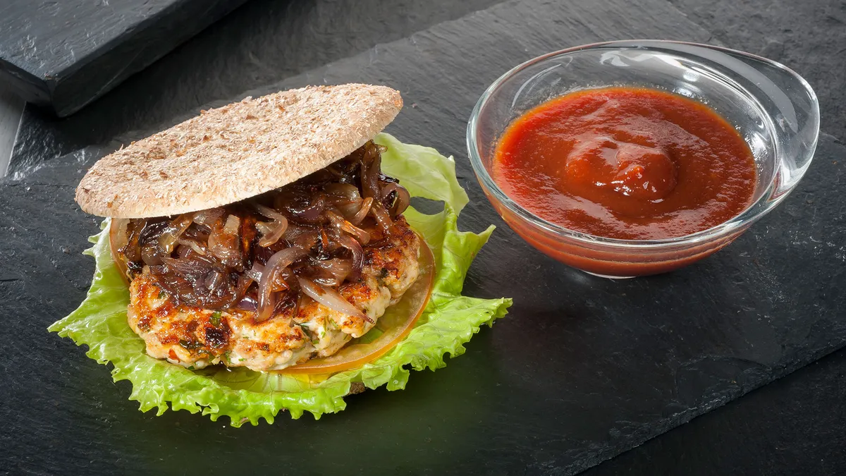 Hamburguesa de pollo con kétchup casero, una receta ideal para deportistas elaborada por el cocinero Josetxo Calvo. También puede ser una perfecta opción para compartir en cenas con amigos.