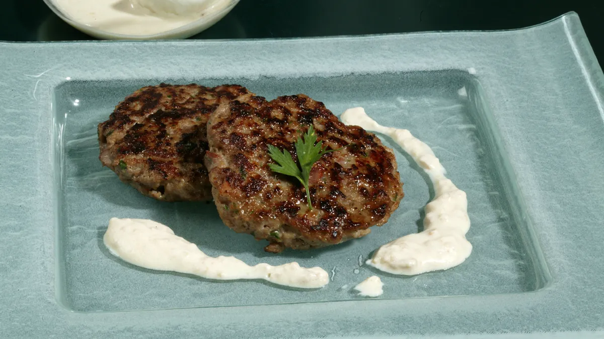 Dales forma y cocínalas en la plancha, e minutos por cada lado. Sirve las hamburguesas en una fuente y acompaña con un poco de salsa de queso. Adorna con una ramita de perejil.