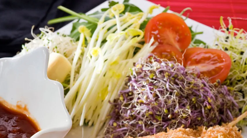 Receta de kushi-katsu de cerdo en salsa tonkatsu, son brochetas de lomo de cerdo empanadas, con salsa de tomate especial y palmitos de bambú, de Iwao Komiyama.