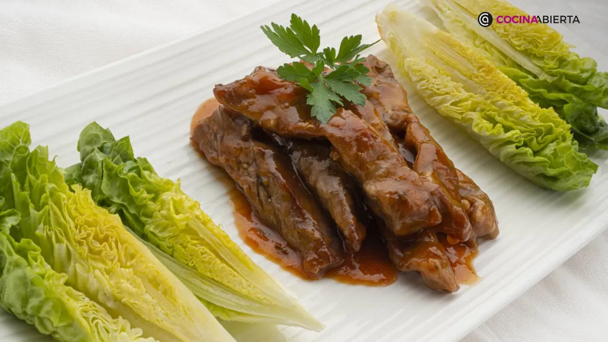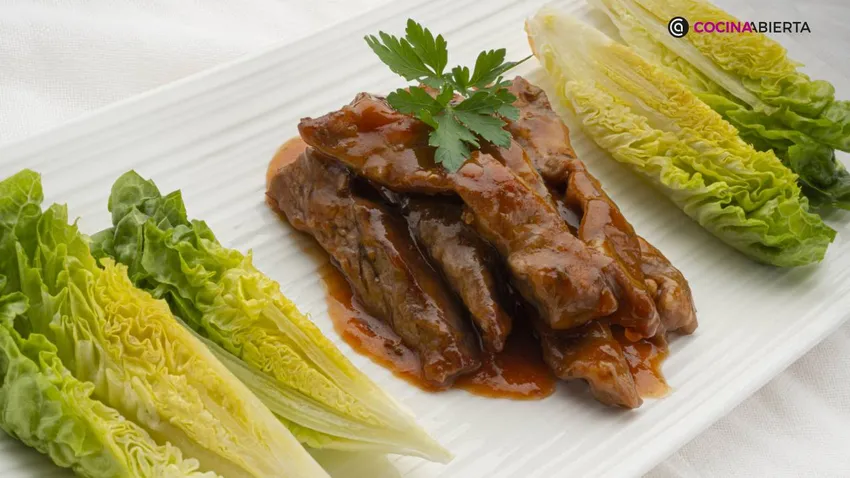 Sirve en cada plato unas tiras de carne de lagarto ibérico y 3 trozos de cogollo. Decóralos con unas hojas de perejil.