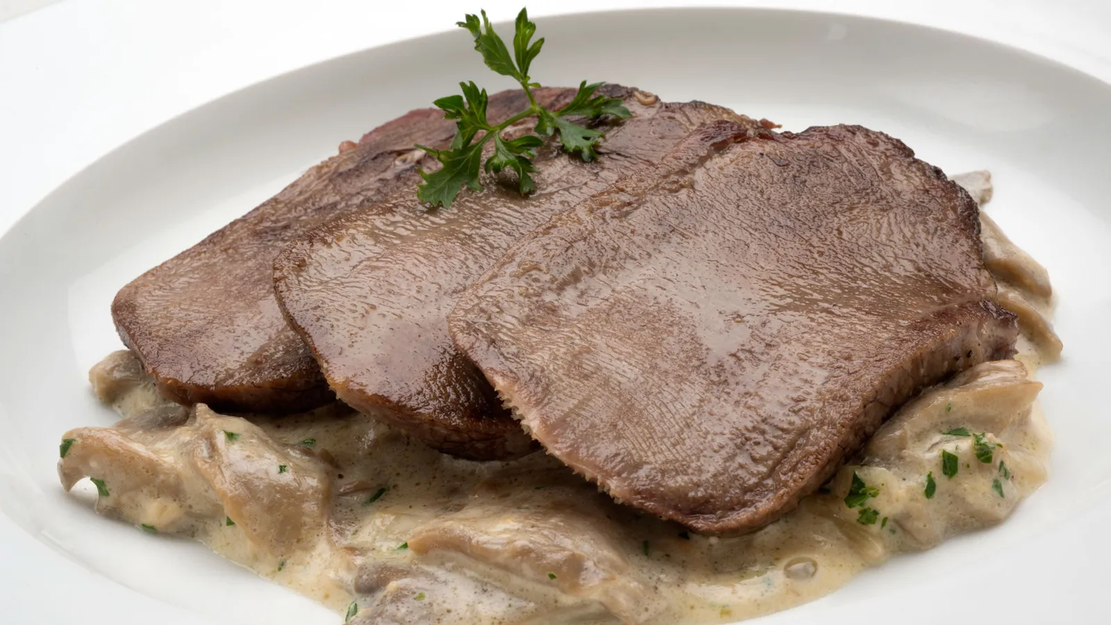 Calienta una plancha con un chorrito de aceite. Coloca los filetes de lengua, sazona con sal gorda y dóralos por los 2 lados. Sirve los filetes de lengua y acompáñalos con las setas. Adorna con unas hojas de perejil.