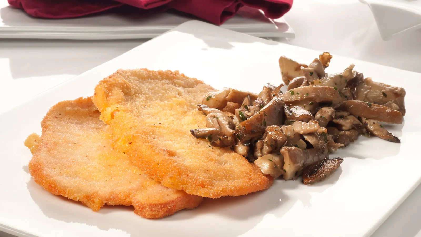 Sirve 2 lomos empanados por comensal y acompaña con el salteado de setas.