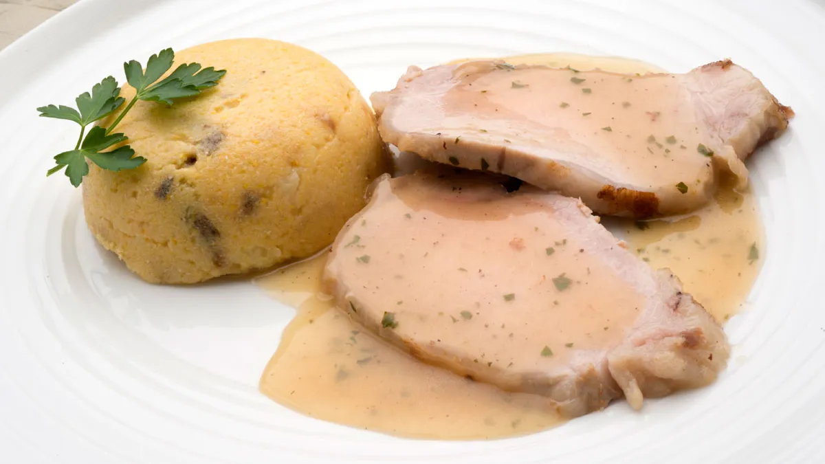 Receta de Karlos Arguiñano de lomo de cerdo a la canela acompañado de polenta de manzana y ciruelas y salsa de vino fino, un plato perfecto para servir el lomo de una forma diferente.