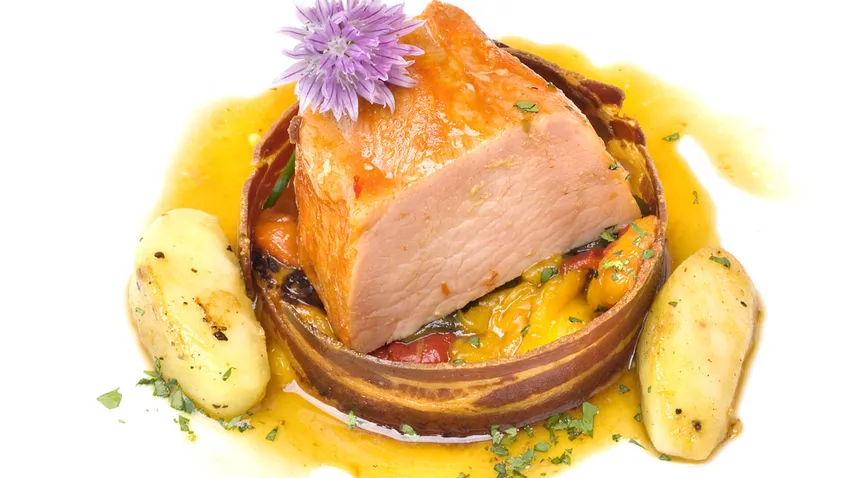 Lomo de cerdo a baja temperatura en su jugo y con pimientos