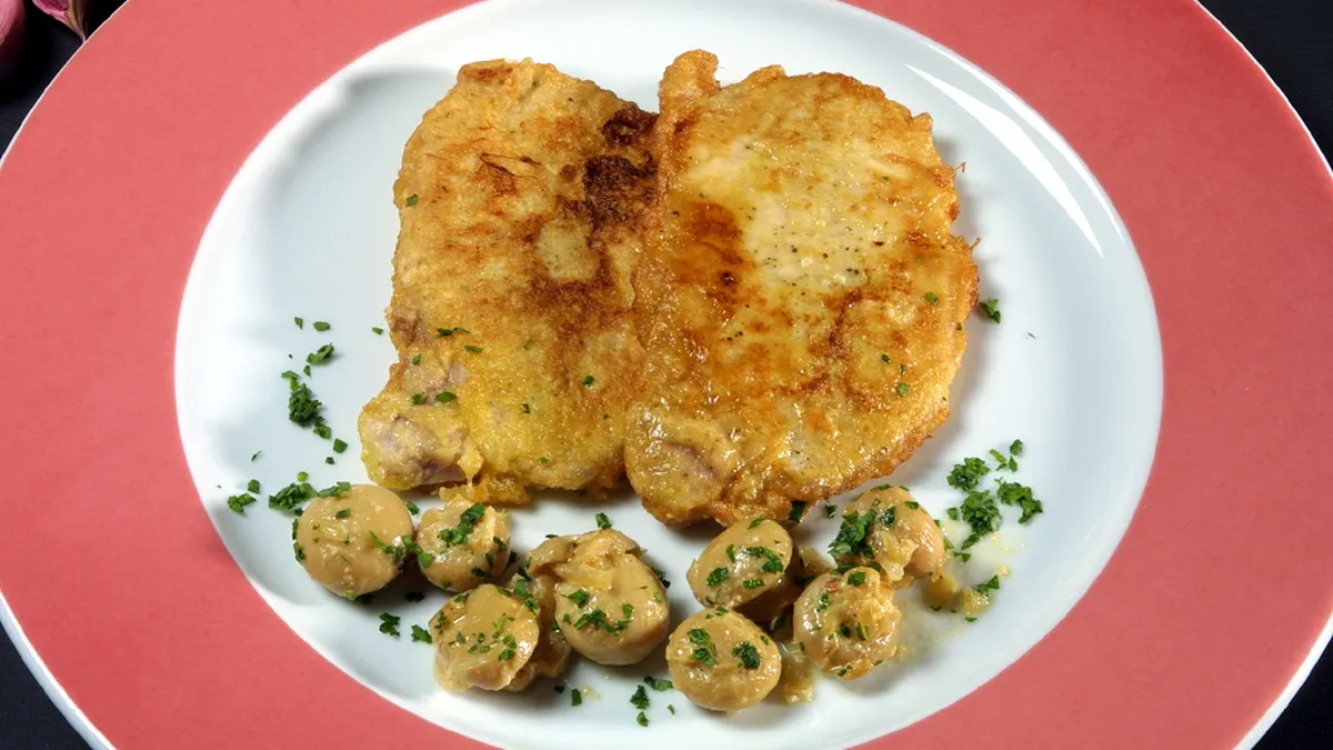 Receta de Lomo de cerdo con champiñones. Karlos Arguiñano realiza una receta fácil, unos filetes empanados de lomo de cerdo con una salsa de champiñones.