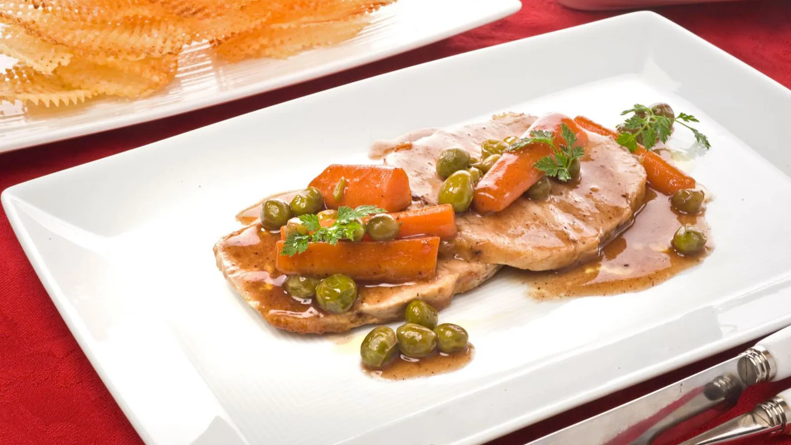 Receta de lomo de cerdo con salsa de vinos, Bruno Oteiza cocina los lomos con oporto y vino tinto, acompañado de zanahoria y guisantes.