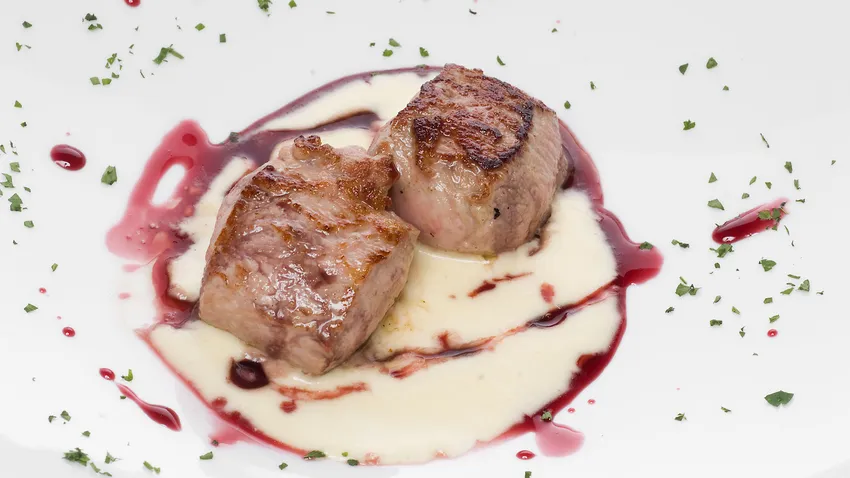 Lomo de cordero con crema de ajo y almendra