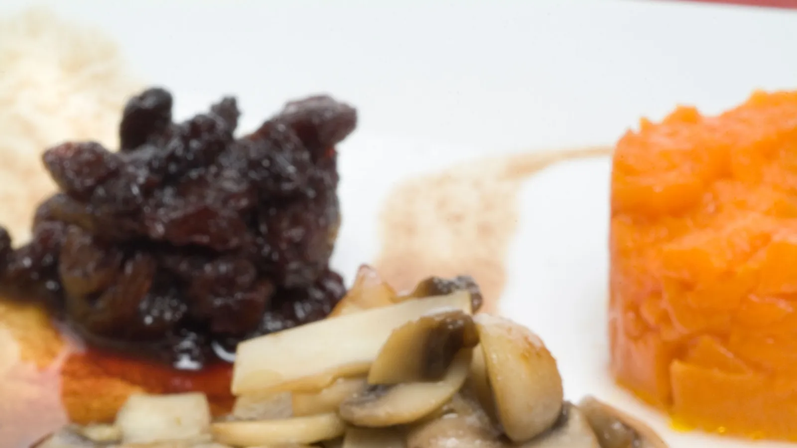 Salpimienta el corzo y dóralo en una sartén con un chorrito de aceite. Introdúcelo en el horno precalentado a 220ºC durante 5 minutos. Sirve el corzo cortado en medallones y acompaña con la calabaza, las pasas (retirados los moldes) junto con la guarnición de champiñones. Salsea.