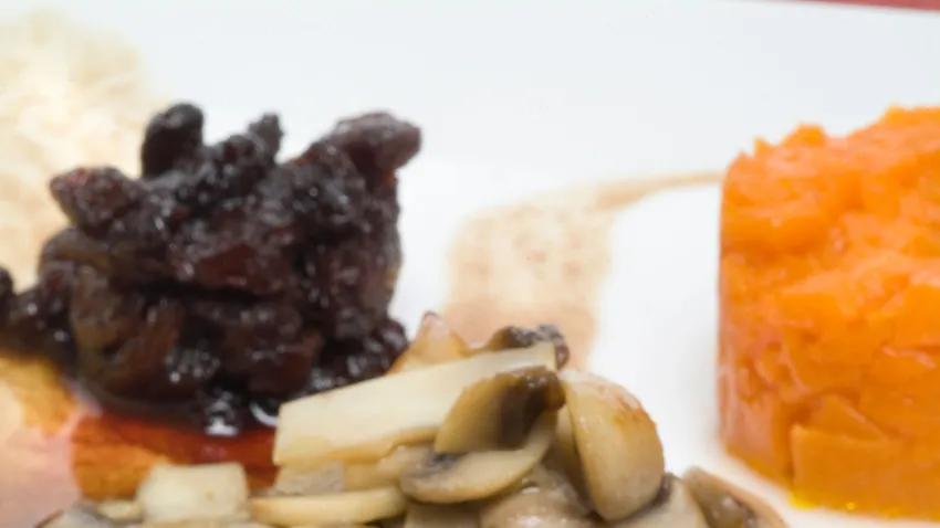 Lomo de corzo asado con pasas y champiñones