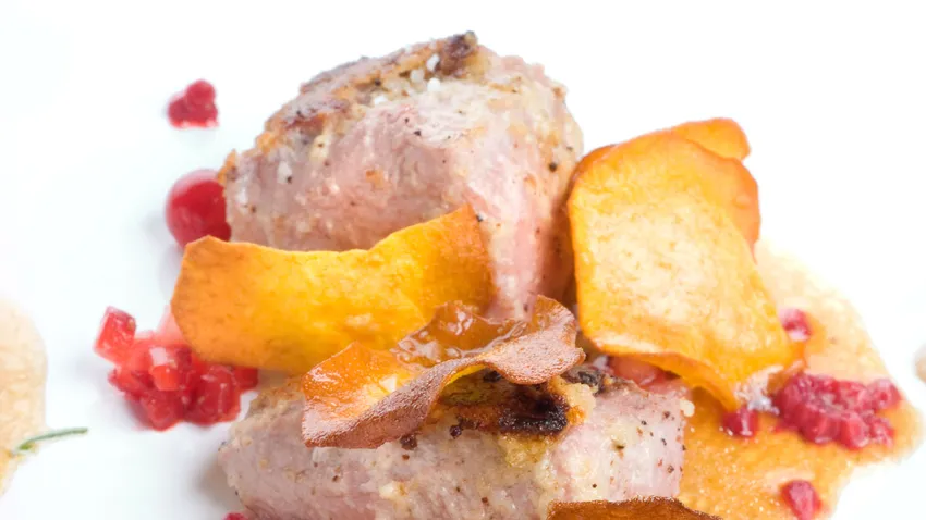 Receta de lomo de jabalí con almendras y frutas rojas, Bruno Oteiza elabora un plato de caza lleno de sabores con boniato frito, caldo de carne, almendras y frutas rojas.