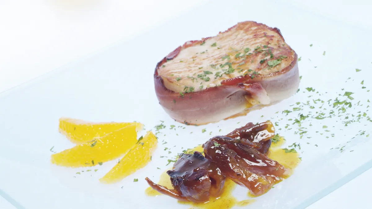 Riquísima receta de lomo a la naranja, rollos de lomo con tocineta y su salsa de dátiles y naranjas, receta de Eva Arguiñano.