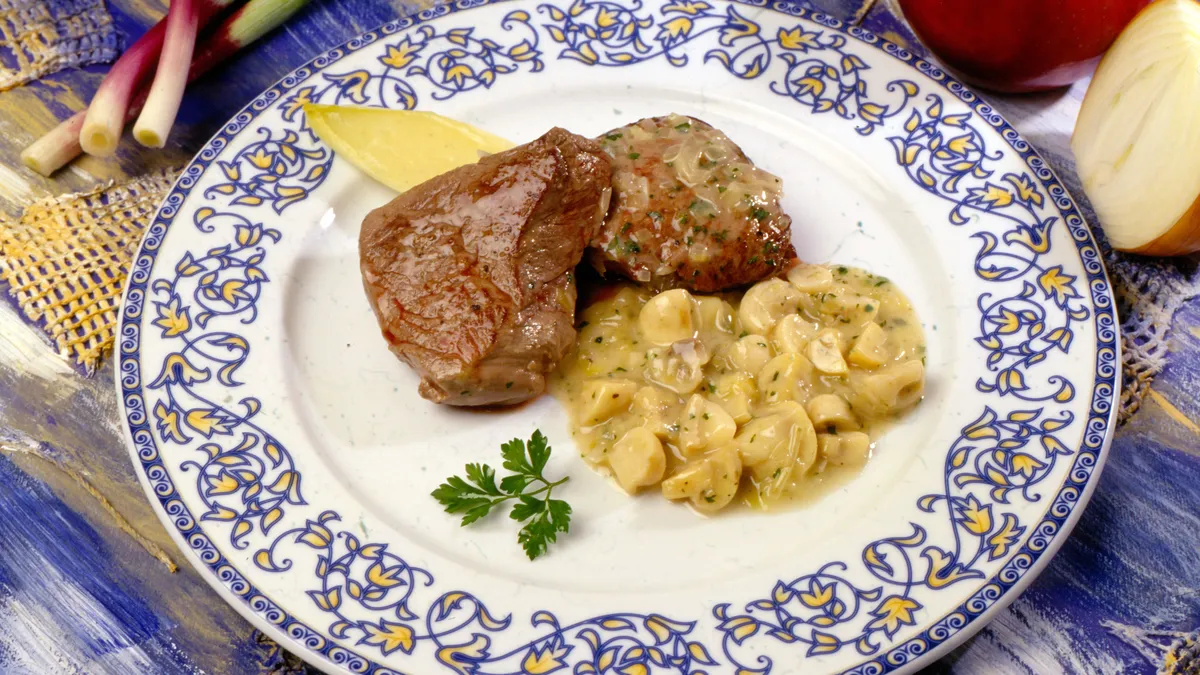 Receta de medallones de lomo de cerdo guisados a la normanda con una salsa de champiñones y vino blanco Receta de Karlos Arguiñano en Argentina.