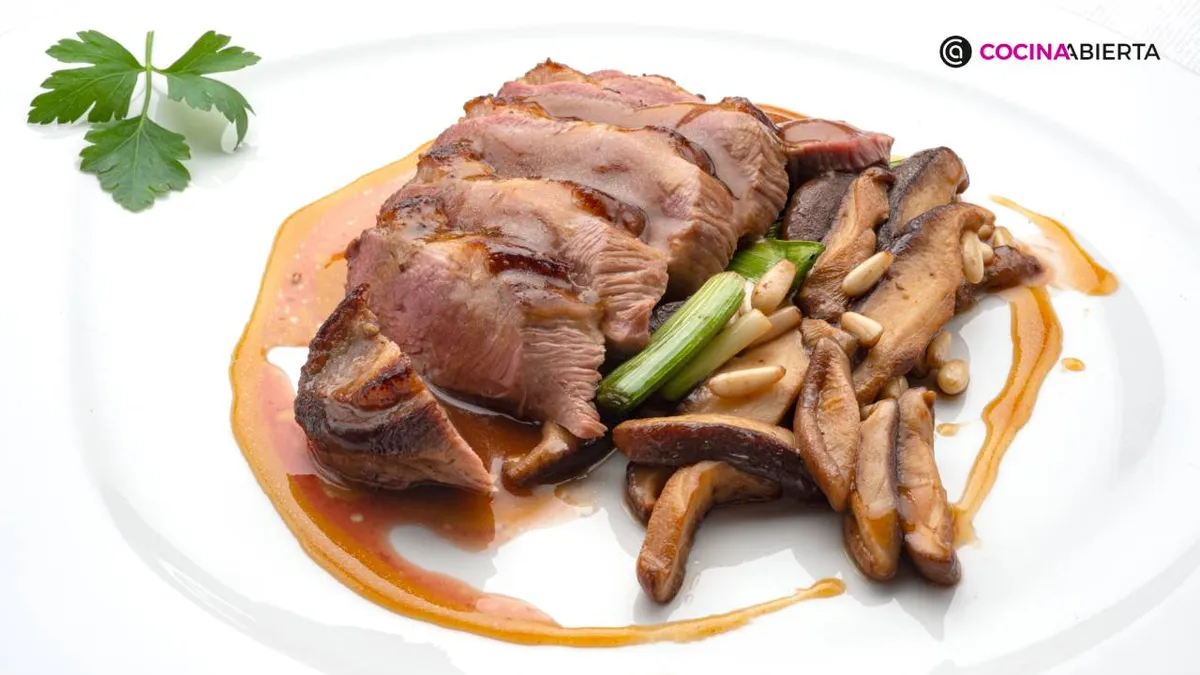En esta receta, Joseba Arguiñano sirve el magret de pato con la salsa katsuobushi y jengibre, y sugiere acompañarlo con setas shiitake salteadas con piñones y ajos frescos.