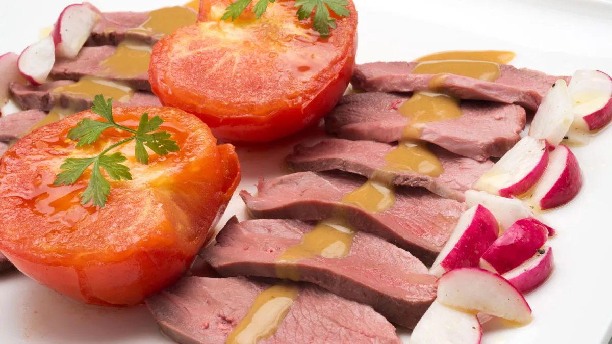 Receta de Karlos Arguiñano de magret frío asado con salsa de miel y mostaza y acompañado de tomates asados en la sartén y rabanitos.