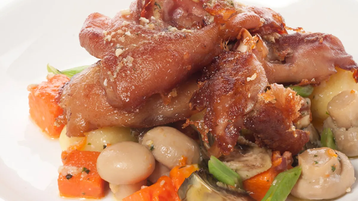 Receta de manitas de cerdo y ñoquis de patata con una salsa de pesto y champiñones.
