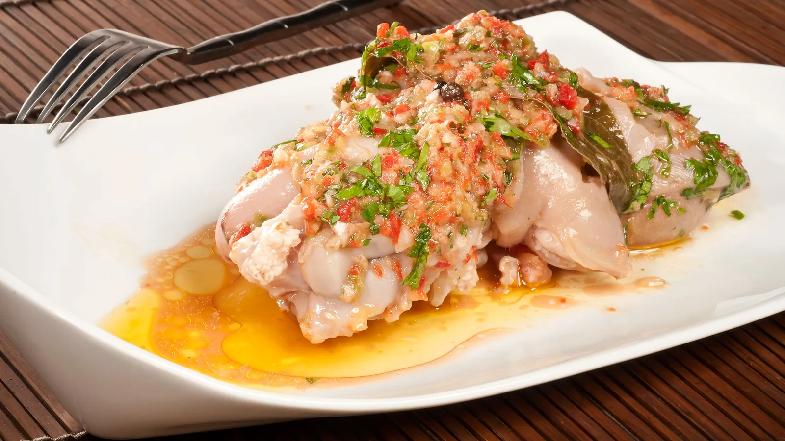 Sirve las manitas en una fuente. Esparce por encima la vinagreta y espolvorea con perejil picado.