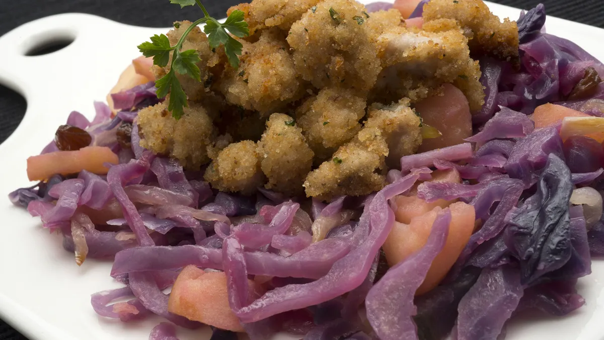 Mollejas de cordero con lombarda, manzana y pasas