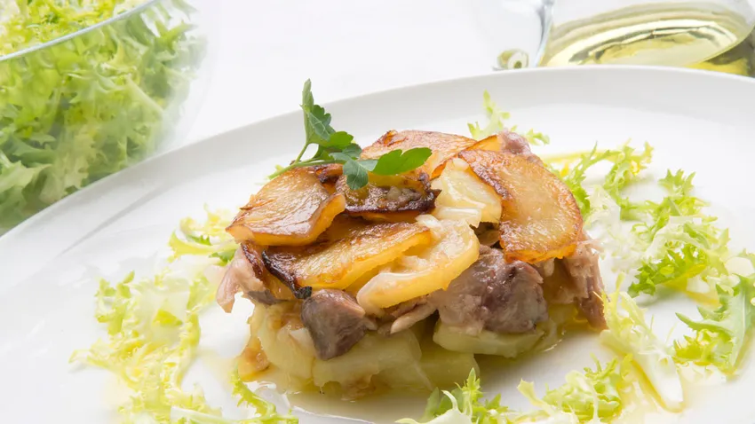 Receta de Karlos Arguiñano de montadito de codillo asado y patatas panadera acompañado de ensalada verde de escarola.