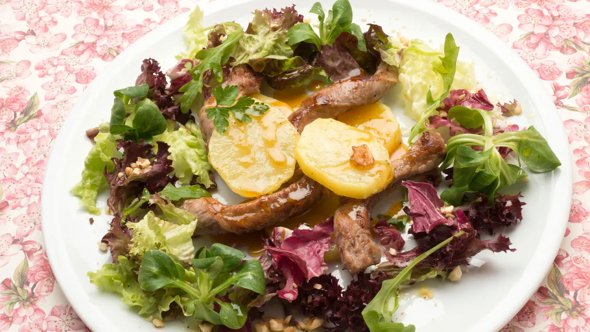Receta de Karlos Arguiñano de montaditos de lágrimas de cerdo ibérico a la plancha acompañados de lechuga, patatas asadas, avellanas picadas y salsa agridulce.
