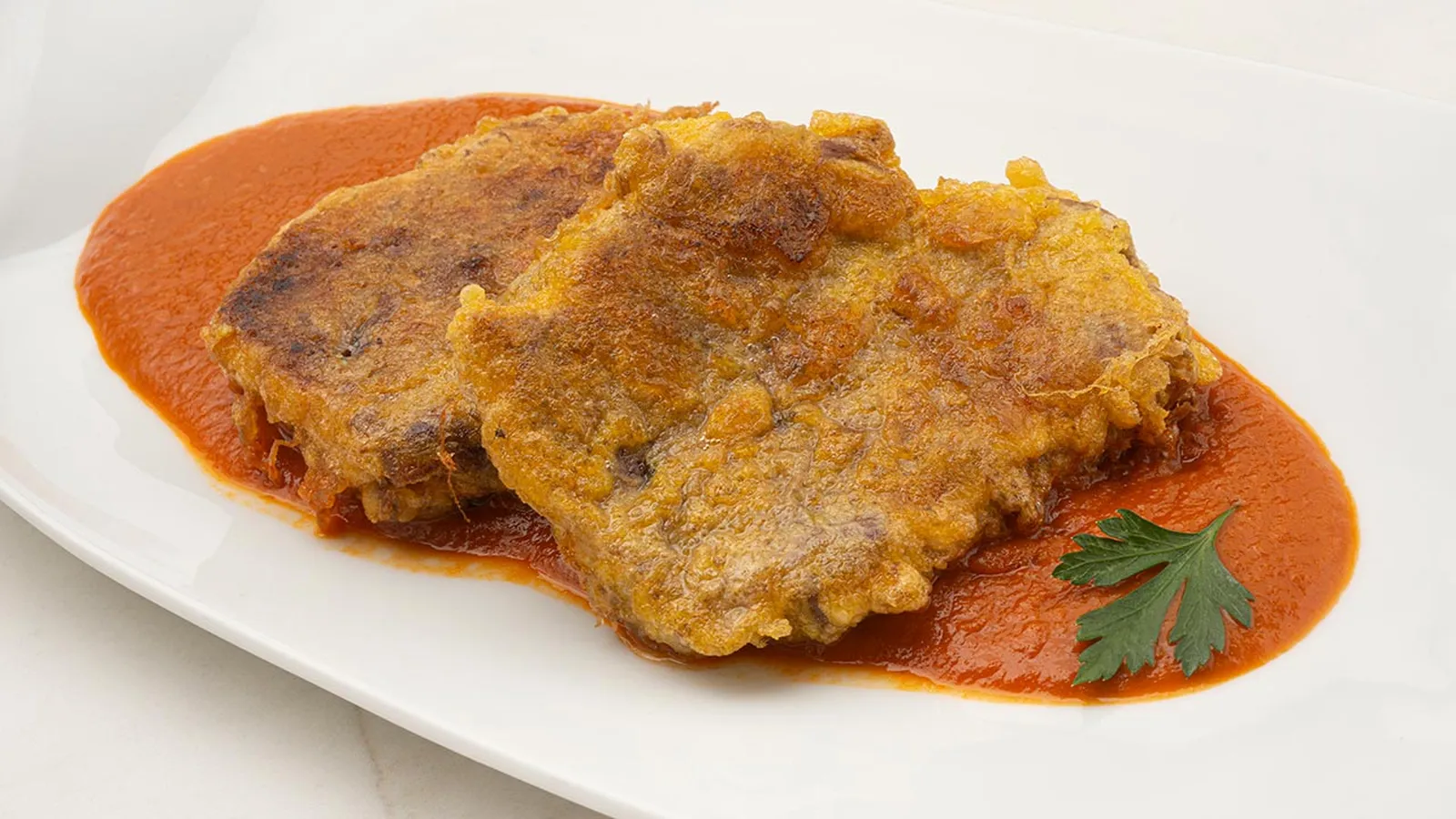 Coloca la salsa vizcaína en el fondo de los platos y pon encima los filetes de zancarrón. Decóralos con unas hojas de perejil.